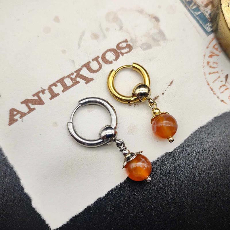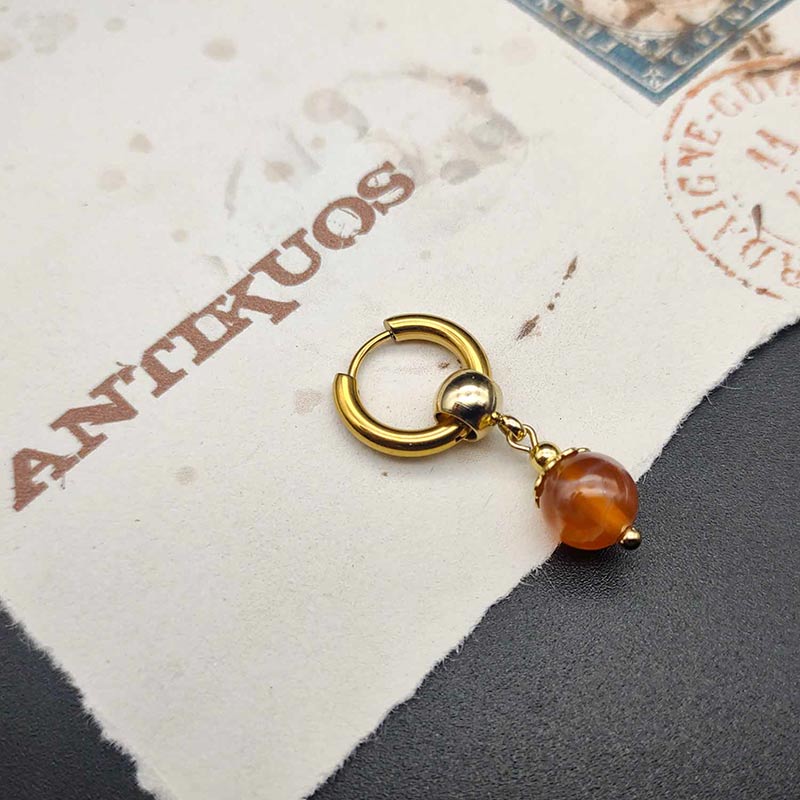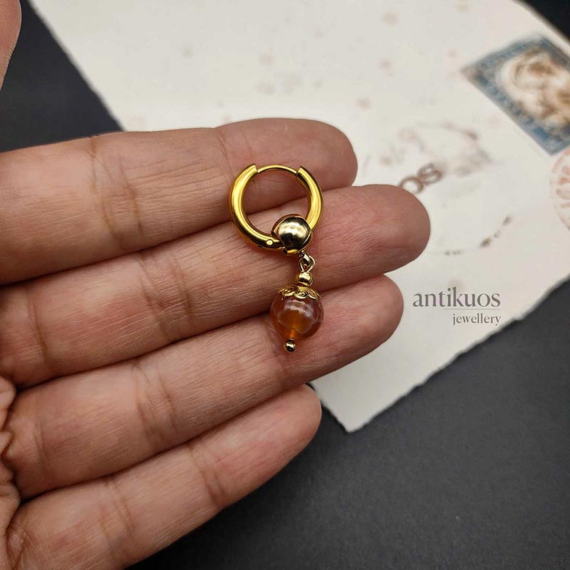 A beautiful transparent orange FIRE AGATE gemstone ( 8 mm) dangles from  stainless steel hoop and bail to minimise allergies.